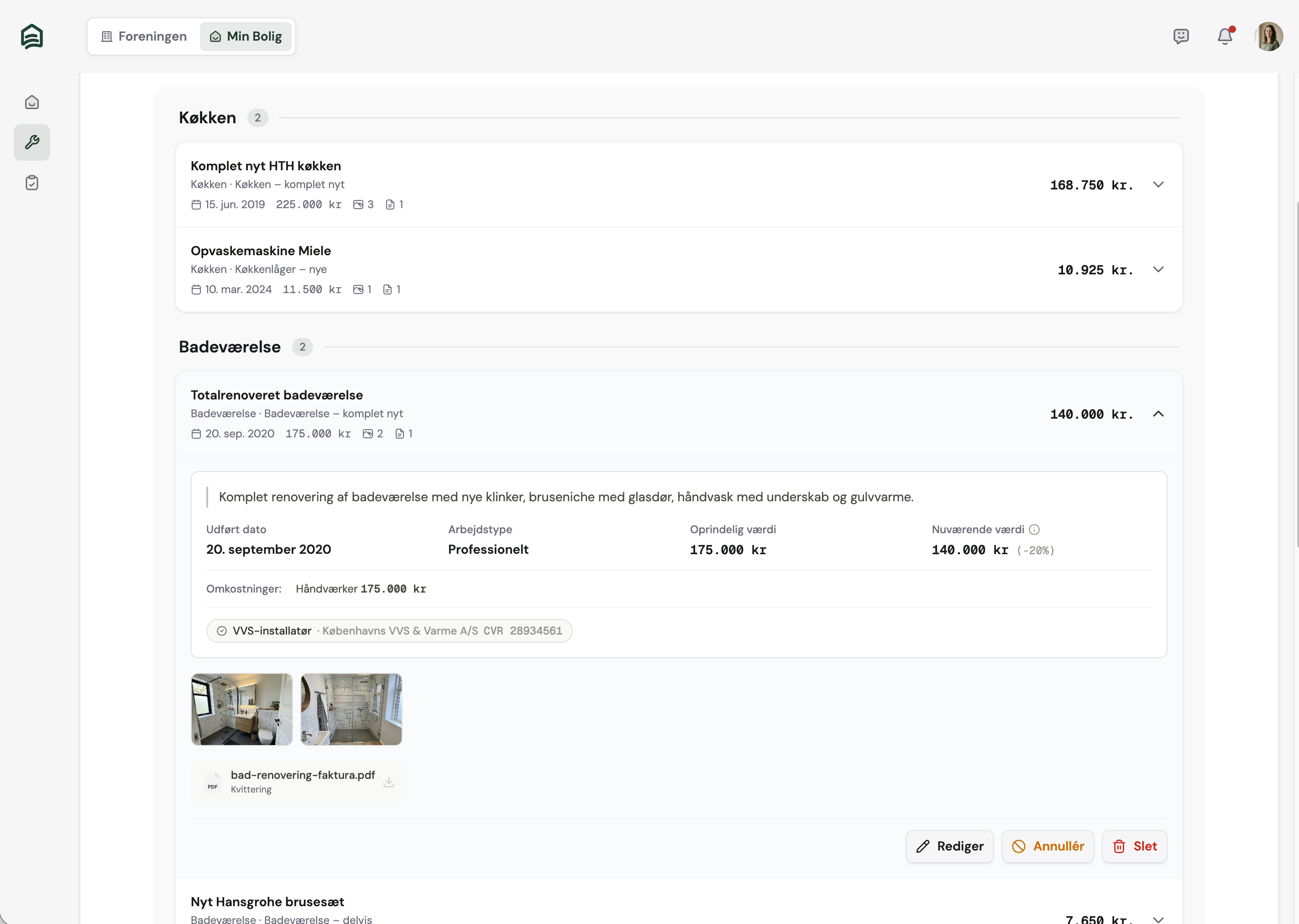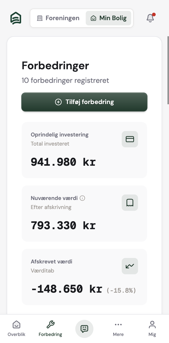 Registrér med billeder og kvitteringer. Systemet beregner restværdien automatisk, så du altid ved hvad din bolig er værd ved salg.
