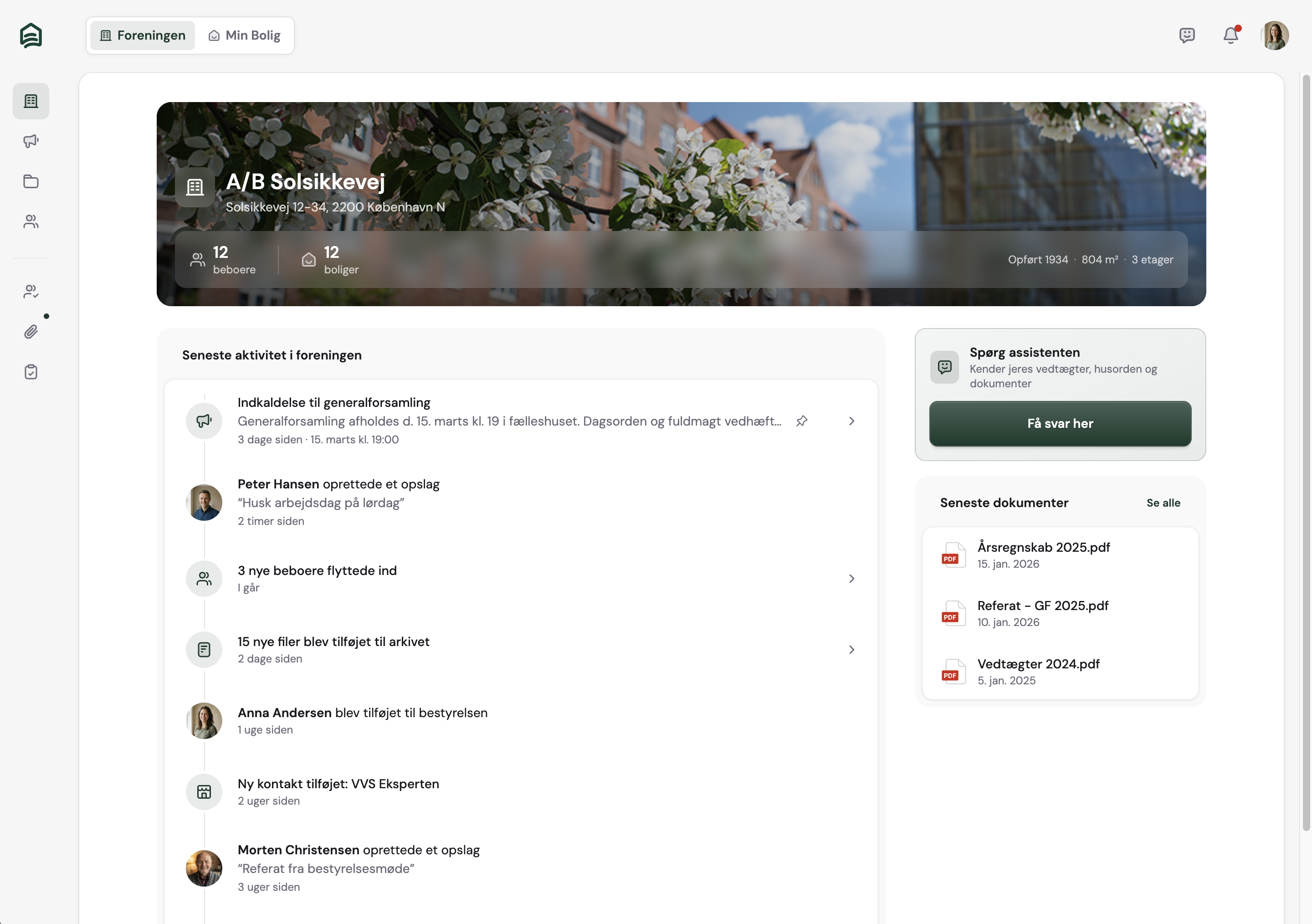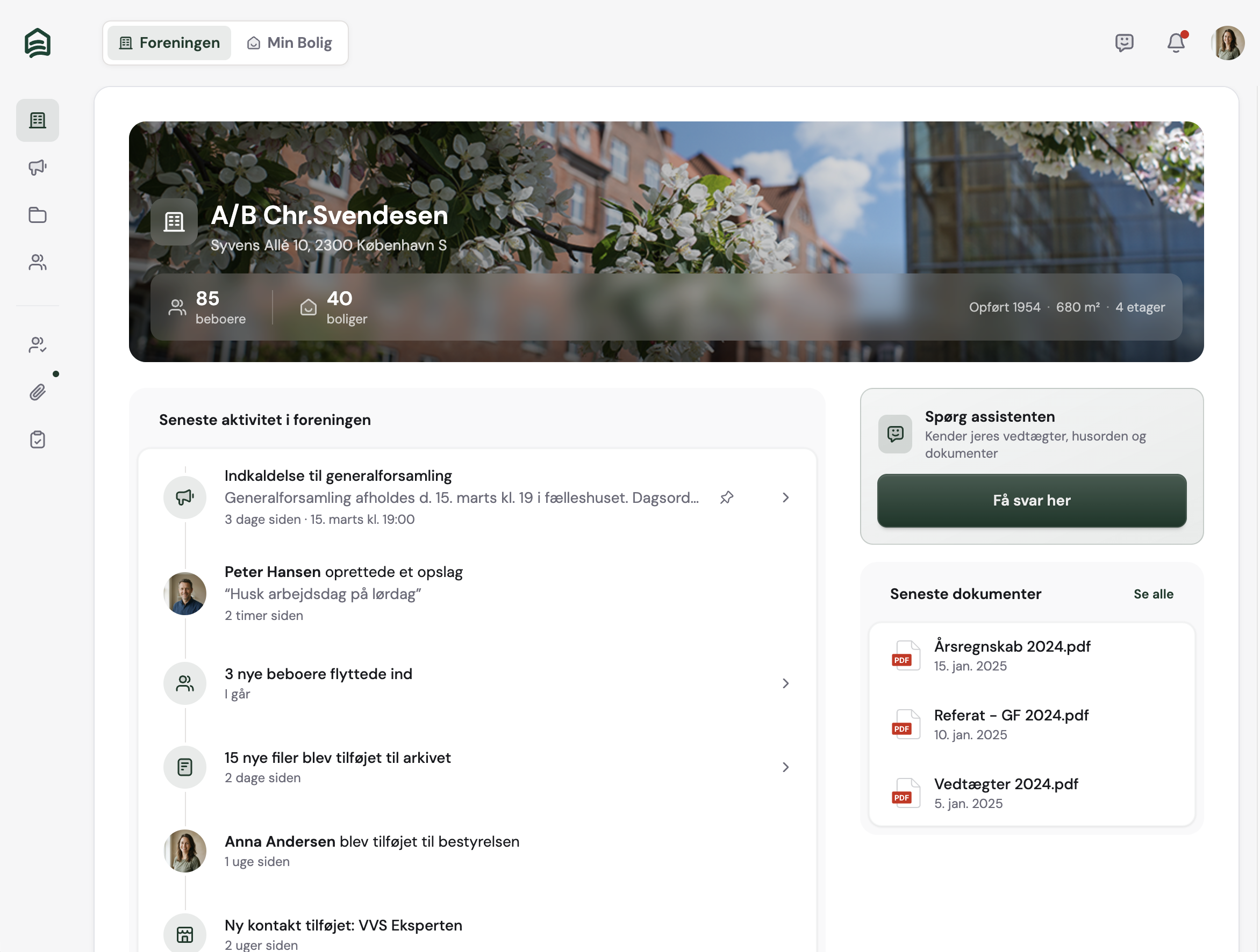 Beboere og bestyrelse får svar baseret på foreningens egne dokumenter. Med kildehenvisninger og adgangsstyring.