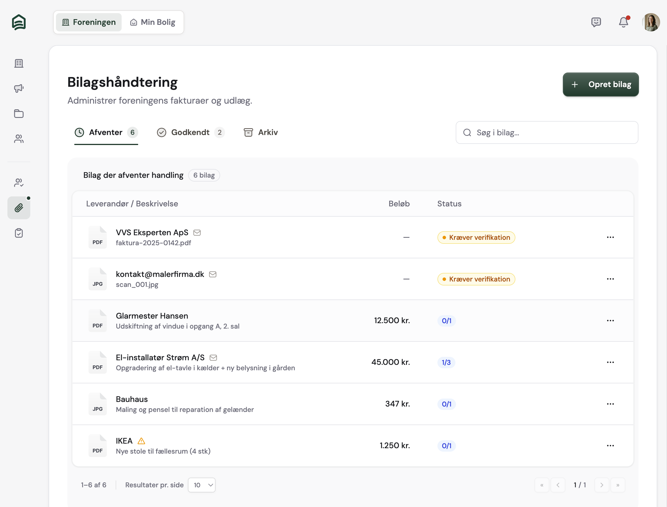 Fakturaer og udlæg med digitalt godkendelsesflow. Send fakturaer direkte fra email, og bestyrelsen godkender med overblik over status og historik.