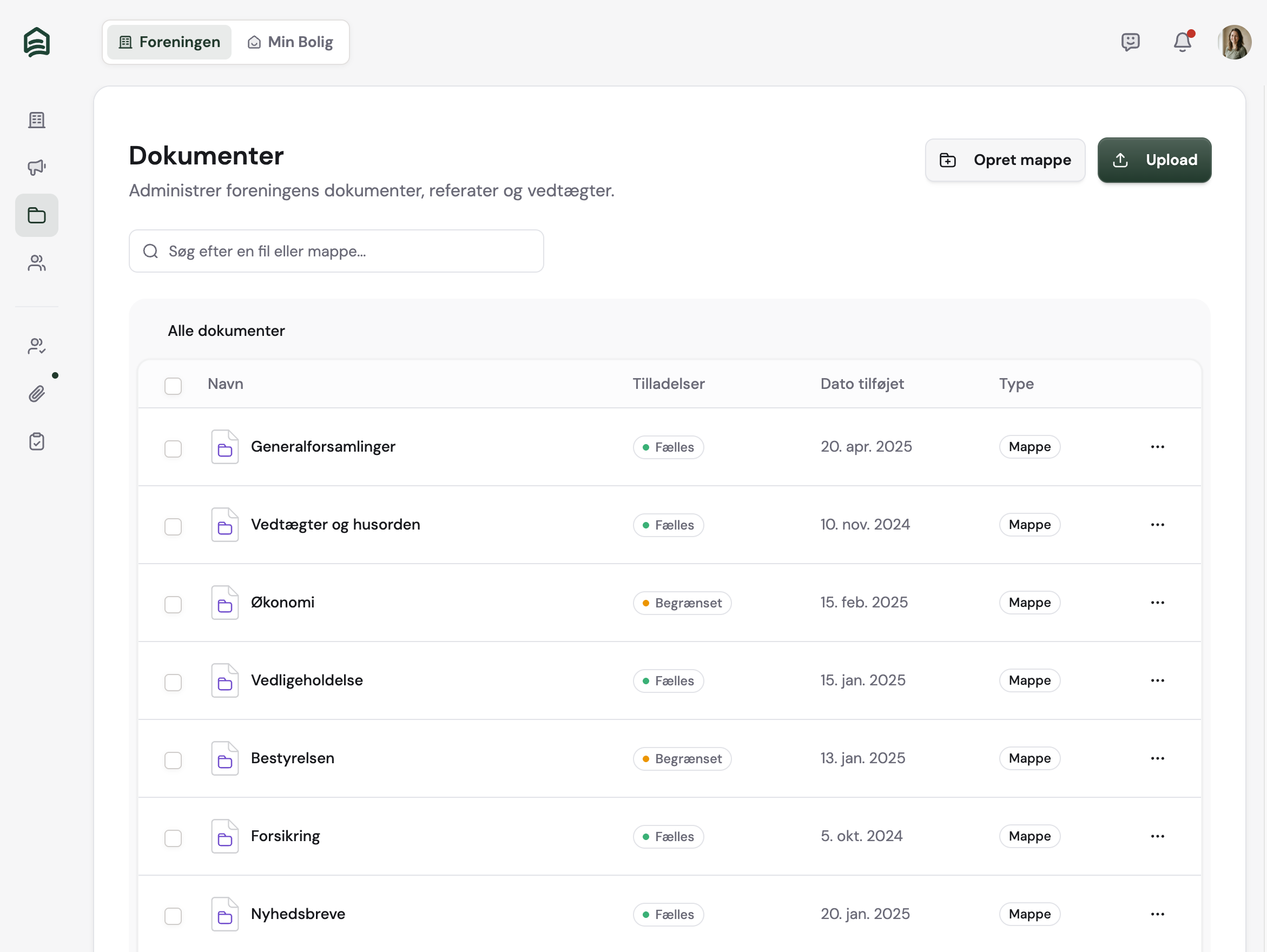 Vedtægter, referater, regnskaber og kontrakter samlet ét sted, med adgangsstyring og søgning. Dokumentationen forbliver i foreningen, uanset hvem der sidder i bestyrelsen.