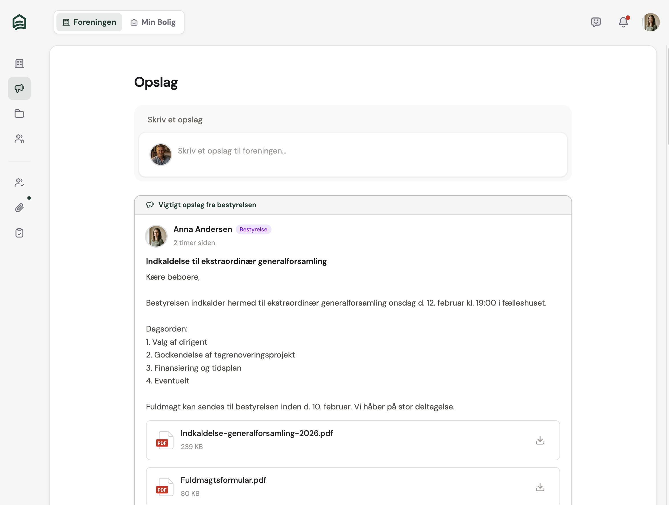 Alle i foreningen kan skrive opslag, kommentere og reagere, samlet ét sted i stedet for spredt i email-tråde og Facebook-grupper.