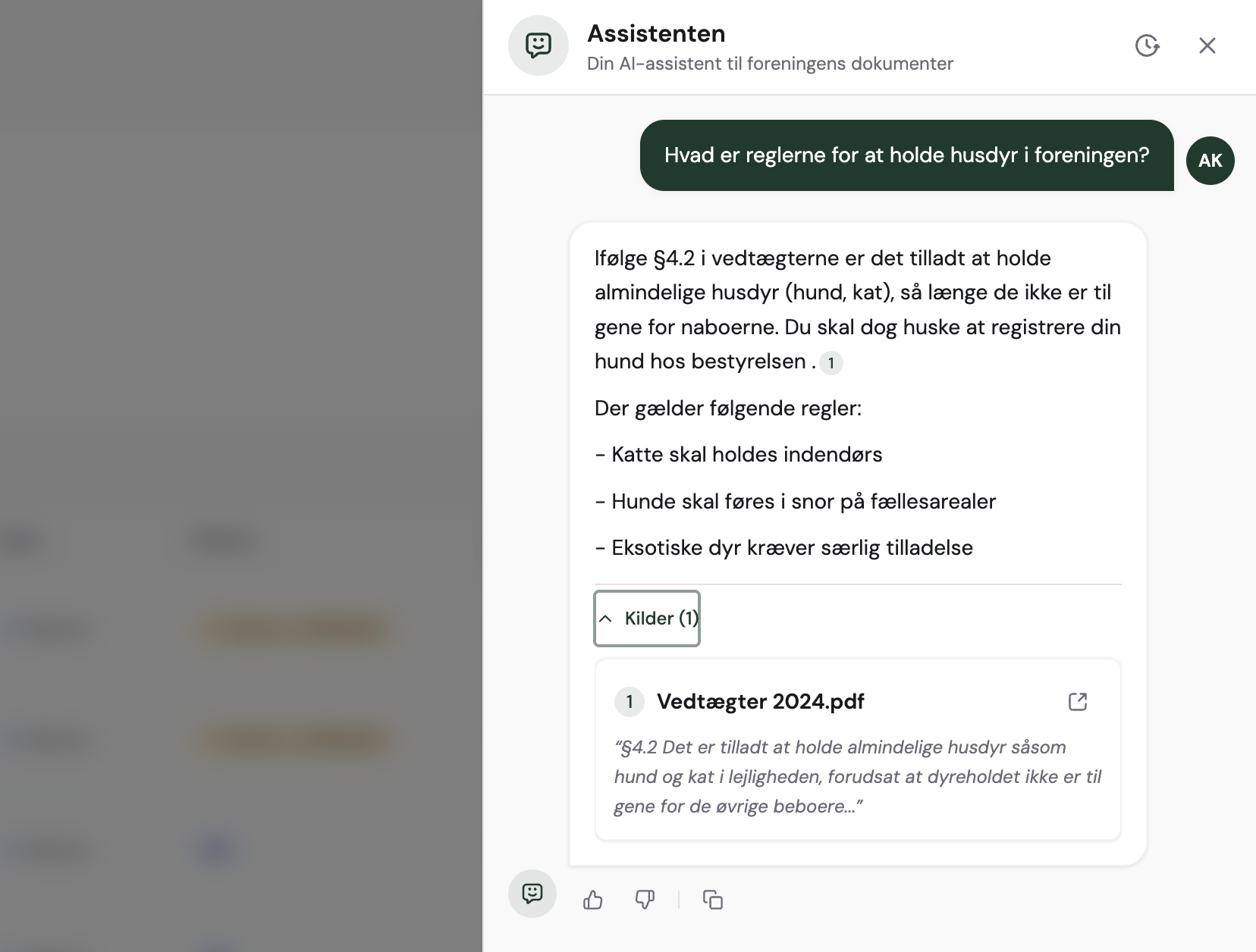 Stil et spørgsmål. Assistenten finder svaret i foreningens dokumenter og viser præcis hvor det står.