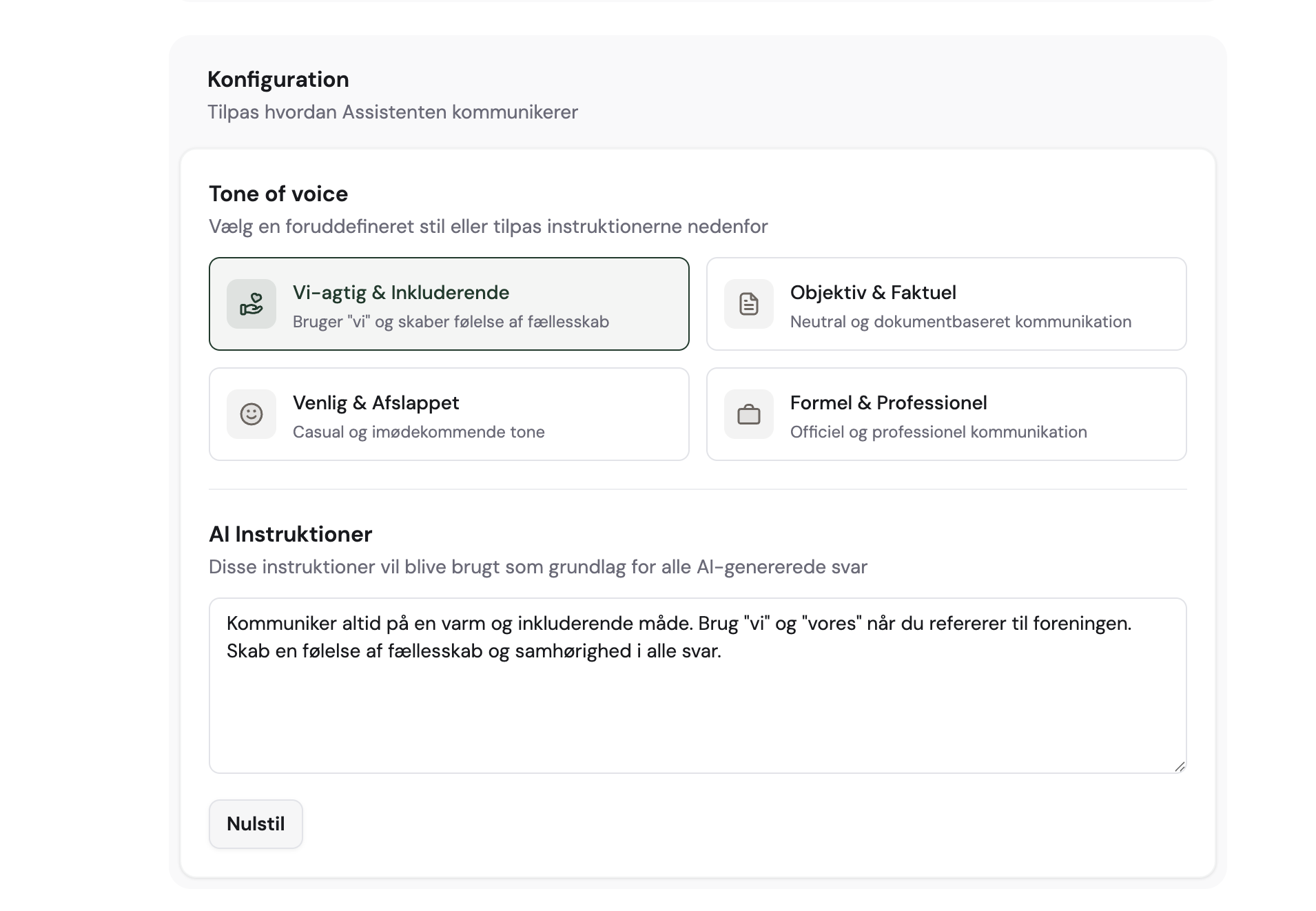 Vælg hvordan Assistenten kommunikerer. Formel, uformel eller tilpasset jeres forenings stil.