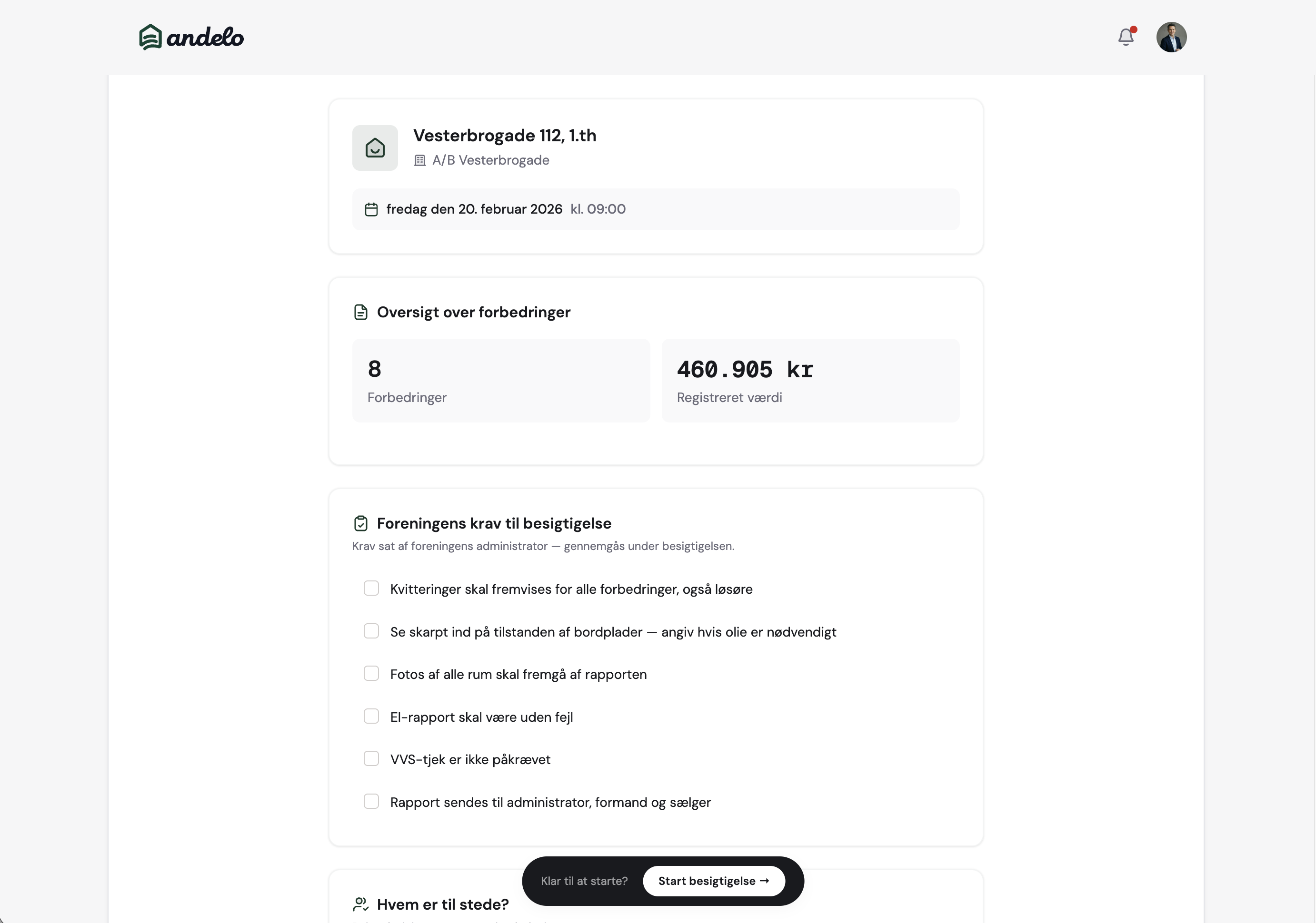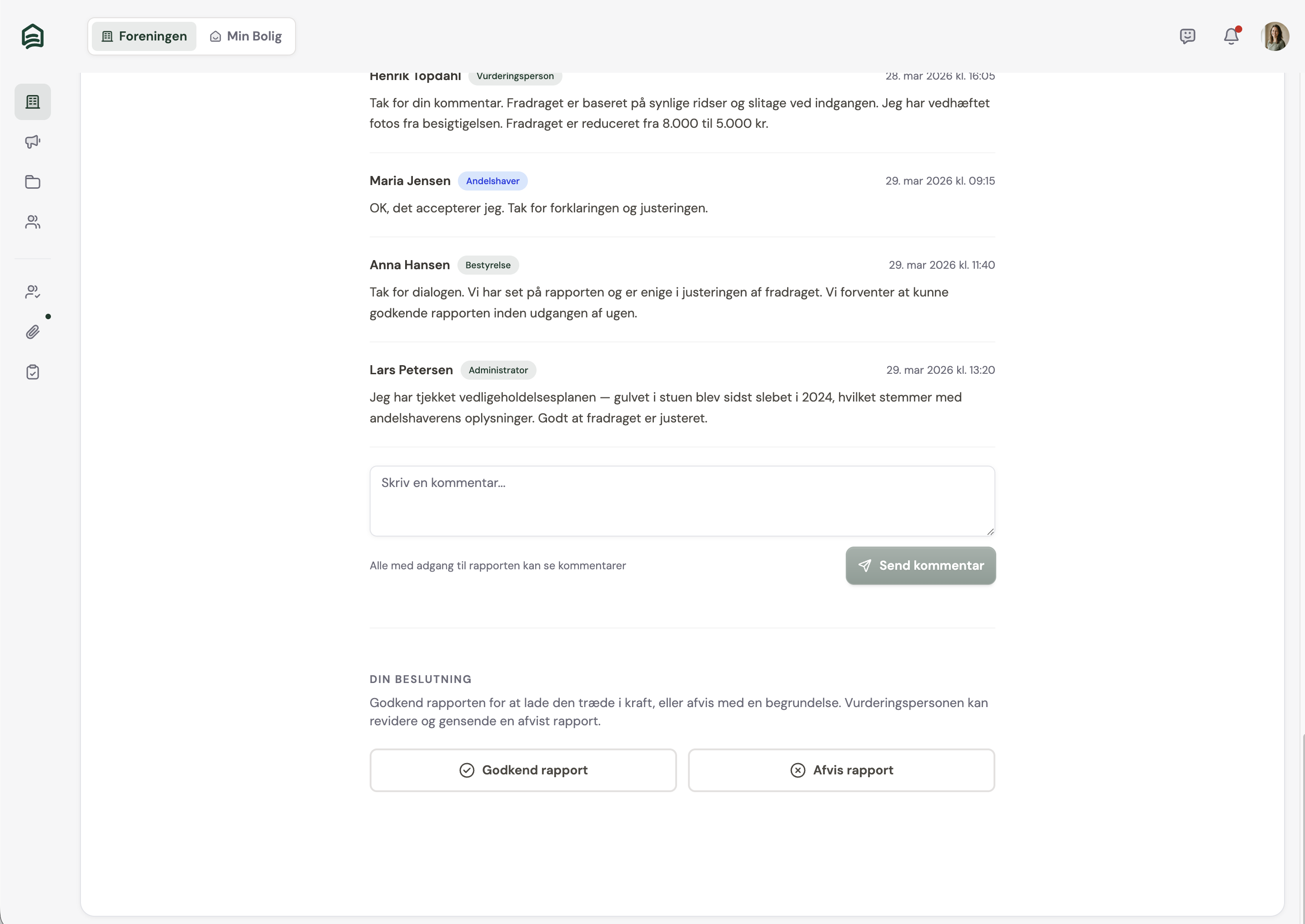 Når rapporten er klar, får bestyrelse og administrator besked, uanset om I bruger Andelo eller ej. Alt er samlet ét sted: vurderinger, dialog og begrundelser.