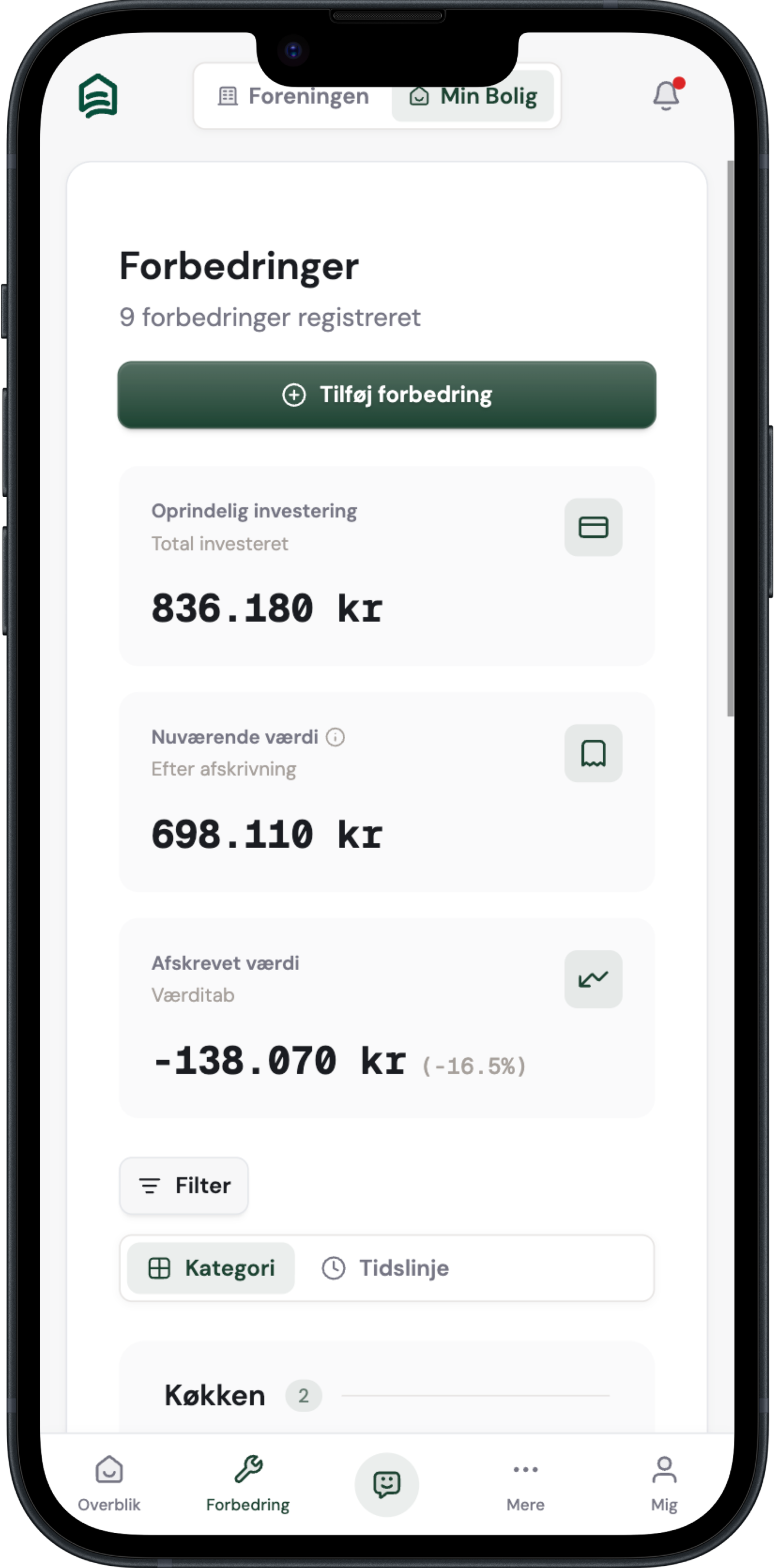 En forbedring er en investering du har lavet i din bolig, f.eks. nyt køkken, bad eller gulv. Når du registrerer den med kvitteringer og billeder, har du dokumentation klar til vurdering og et eventuelt salg. Andelo beregner automatisk hvad forbedringen er værd i dag, baseret på branchens standarder.